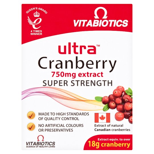 Each Ultra Cranberry tablet from Vitabiotics provides the extract equivalent of 18,750mg (18.75g) of cranberry (Vaccinium macrocarpon)